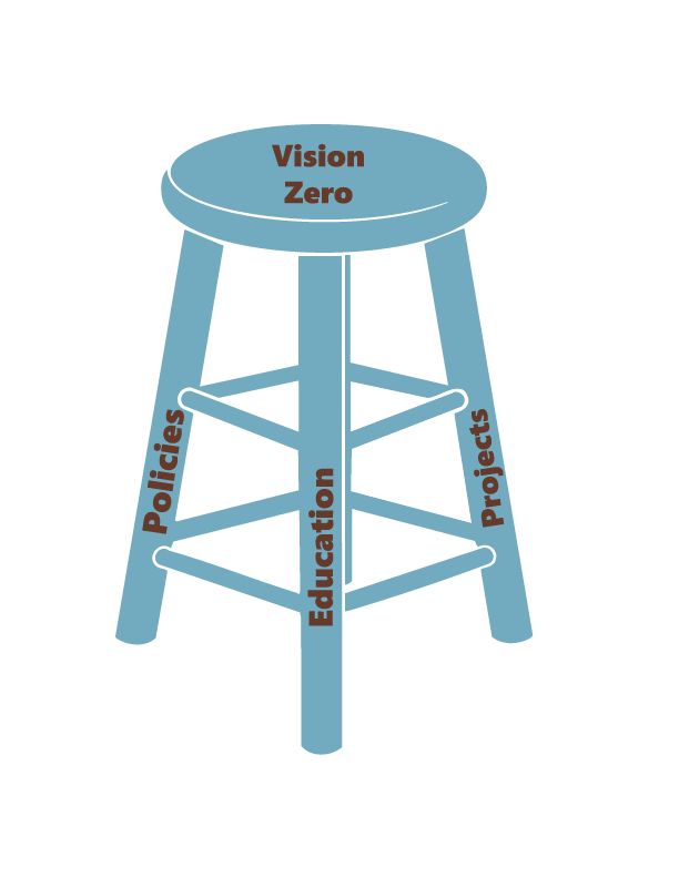 Vision Zero is a strategy aimed at eliminating all traffic fatalities and severe injuries, while promoting safe and healthy mobility for all. The 3-Legged Stool Approach highlights the interdisciplinary approach to achieve the zero-traffic death goal. It also breaks down the solutions into policies, education/enforcement, and projects.